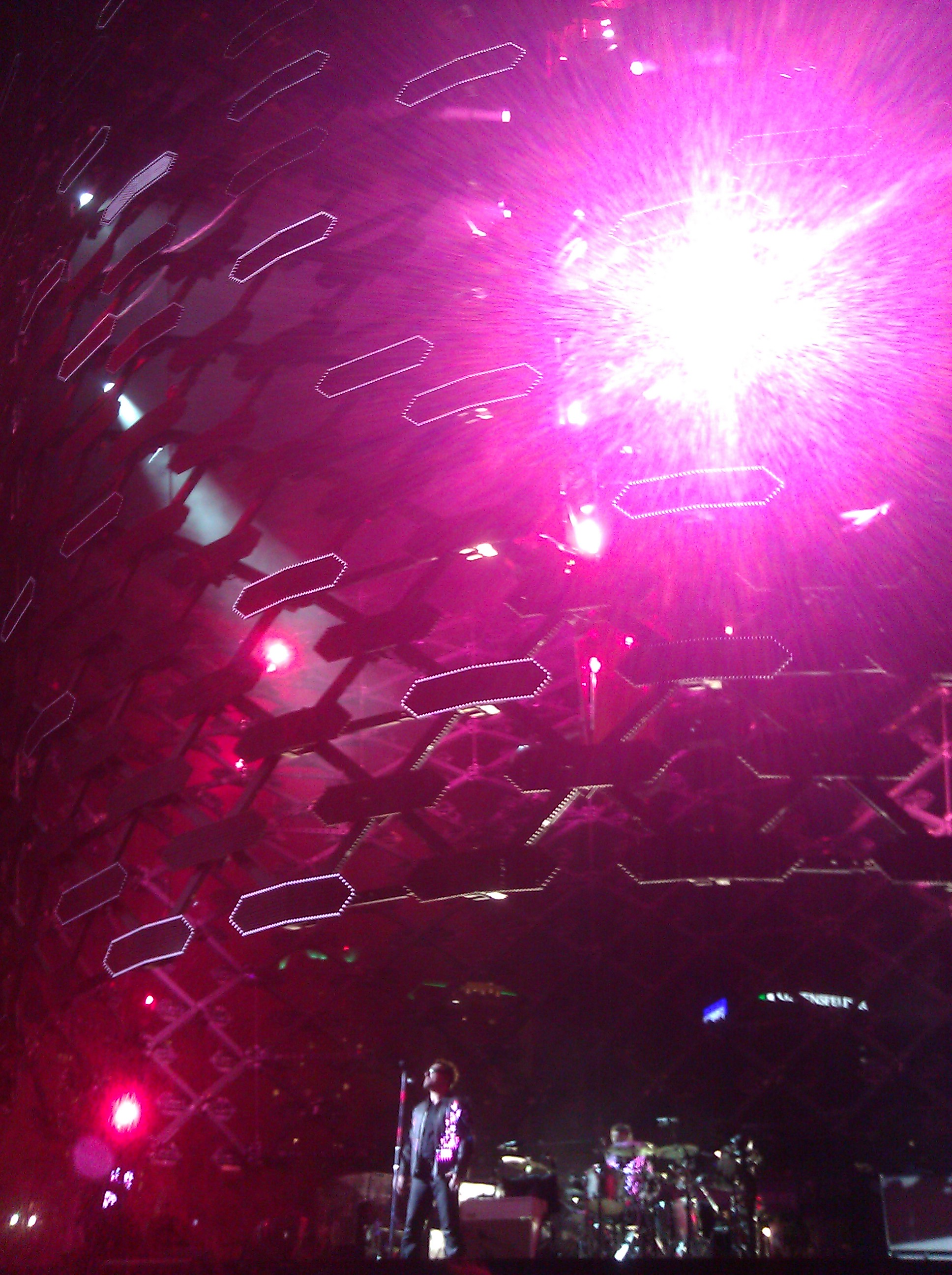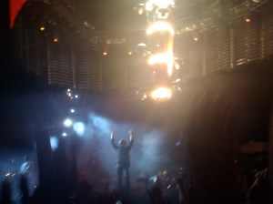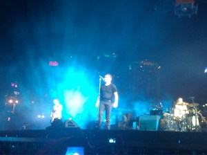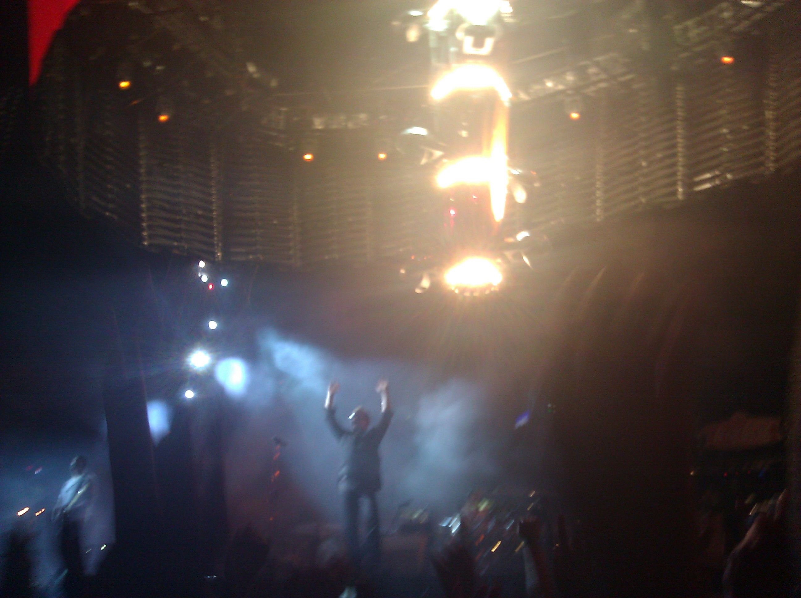 Below was probably one of my favorite moments of the concert. Bono had just finished talking about a woman freed from slavery through the efforts of Amnesty International. He asked everyone to raise their hands, and he just started singing a simple chorus of “Rejoice!” over and over, and soon the entire stadium joined in. It was a powerful, spiritual experience: